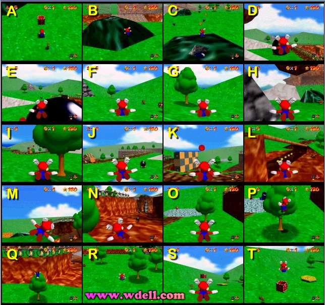 Have you ever seen a face in the dirt texture in course 1? I actually can see lots of "dirty faces" if I look real hard. The easiest one to explain, though, goes like this: Look at the big bright area to the left of Mario's hat (in the picture below). That is the forehead. The three dark areas below that area are the eyes and mouth. It actually looks a little more like a dog's face than a human's face. This scene reminds me of the scene in the movie, "What Dreams May Come", where they are walking on a sea of faces. That movie has a lot of stylish art.